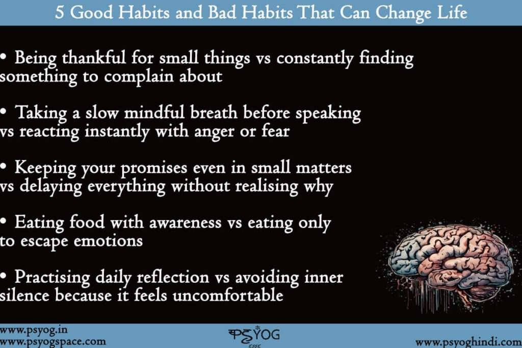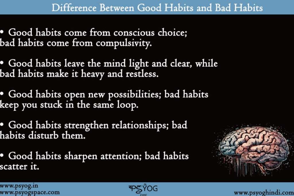 Another difference between good habits and bad habits is the feeling they leave behind in the mind, because good habits make the mind clearer and softer, while bad habits make it heavier and more restless. A third difference is that good habits open possibilities in life, allowing you to grow into a better version of yourself, while bad habits quietly close doors by keeping you stuck in the same emotional loop. A fourth difference is that good habits help relationships, while bad habits disturb them, because conscious behaviour always strengthens trust, while compulsive behaviour breaks it. And a fifth difference is that good habits make your attention sharper, while bad habits scatter your attention, and this scattered attention slowly affects the quality of every choice you make in a day.